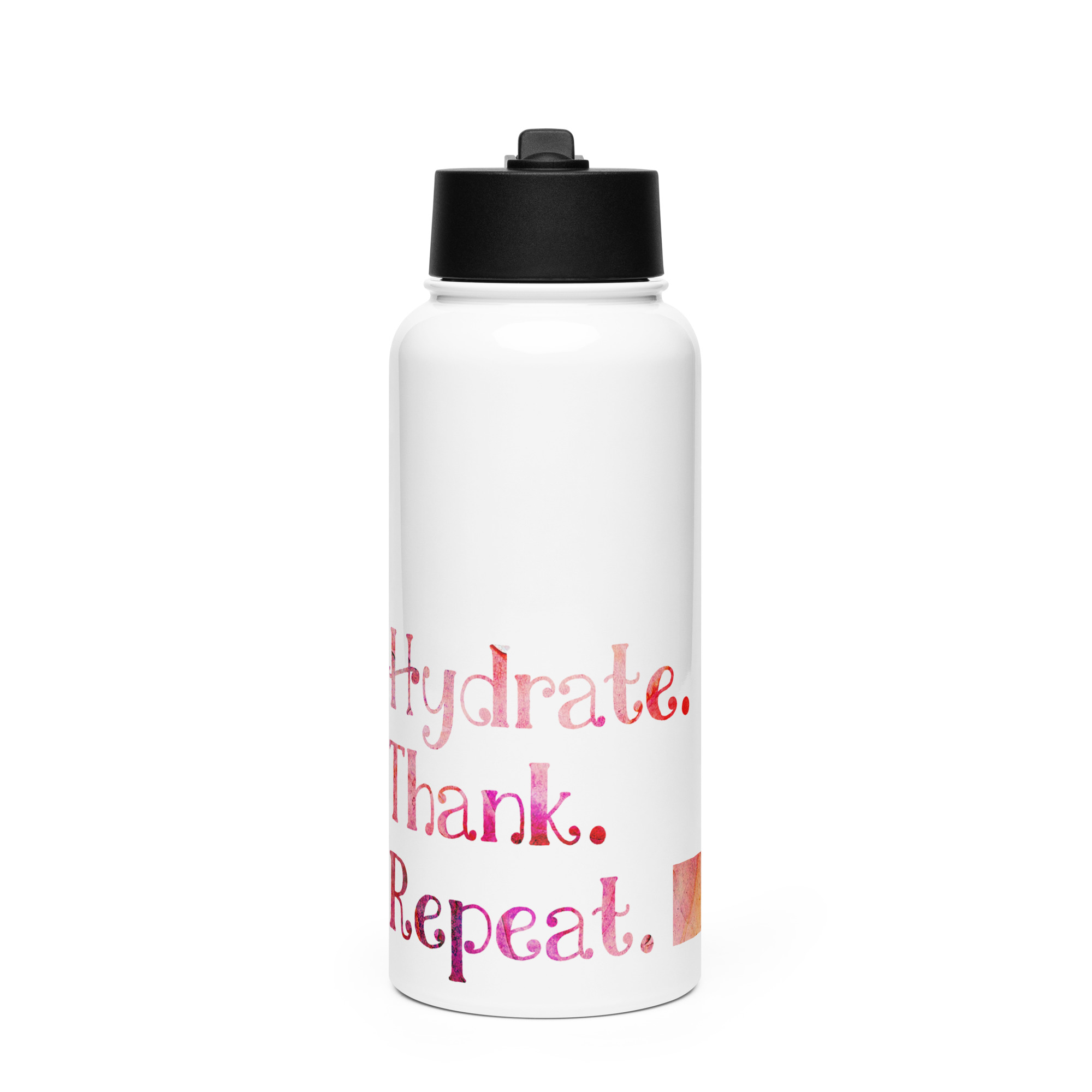 This roomy 32 oz (950 ml) water bottle is ideal for long days and active lifestyles. The wide-mouth foldable straw ensures spill-free drinking while on the go, while the rotating handle makes it easy to carry. Design boldly on the large design area, order this bottle for yourself, or sell it online. Double-walled stainless steel with vacuum insulation. Plastic lid and wide-mouth foldable straw. 32 oz (950 ml). Height: 9. 92″ (25. 2 cm). Diameter: 3. 54″ (9 cm). Glossy finish. Rotating handle. Comes with an anti-slip patch. Blank product sourced from China. Disclaimers:. Not dishwasher or microwave safe. Hand-wash only. Light pressure might be needed to close the lid during the first uses, as it can take a few times for the straw to take the appropriate shape inside the bottle. This product is made on demand. No minimums.