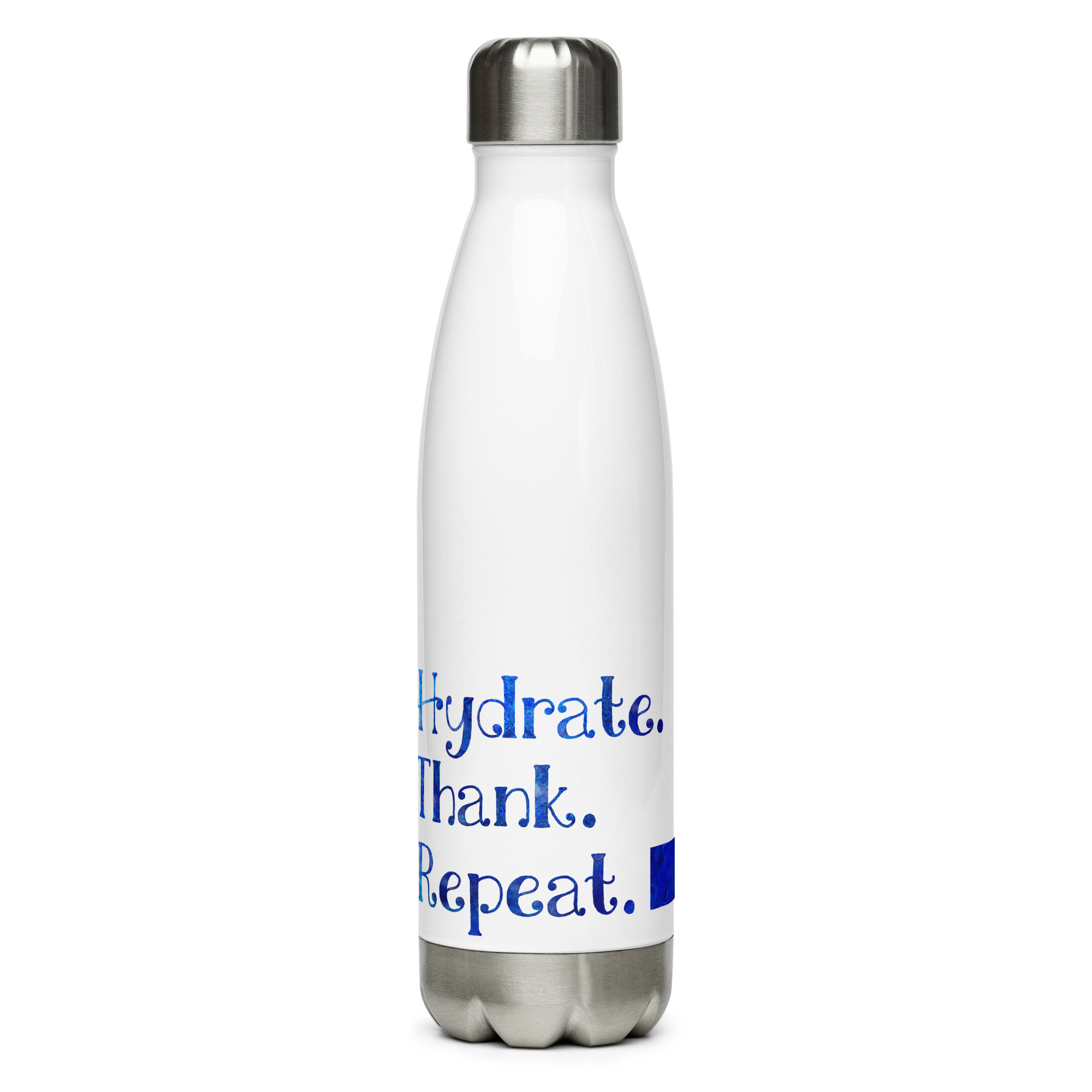 Say hello to our Stainless Steel Water Bottle made from high-grade stainless steel. Its double-wall construction makes it perfect for storing both hot and cold liquids. What’s better than taking that first sip of a coffee in the morning, or having a swig of icy-cold water after a workout? Enjoying your drinks from an easy-to-carry, beautifully designed, reusable bottle!. High-grade stainless steel. 17 oz (500 ml). Dimensions: 10. 5″ × 2. 85″ (27 × 7 cm). Vacuum flask. Double-wall construction. Bowling pin shape. Glossy finish. Odorless and leak-proof cap. Insulated and suitable for hot and cold liquids (keeps the liquid hot or cold for 6 h). Hand-wash only. Blank product sourced from China. Disclaimer: Keeping water in the bottle for over 24 hours is unhygienic and can result in an unpleasant smell. This product is made on demand. No minimums.